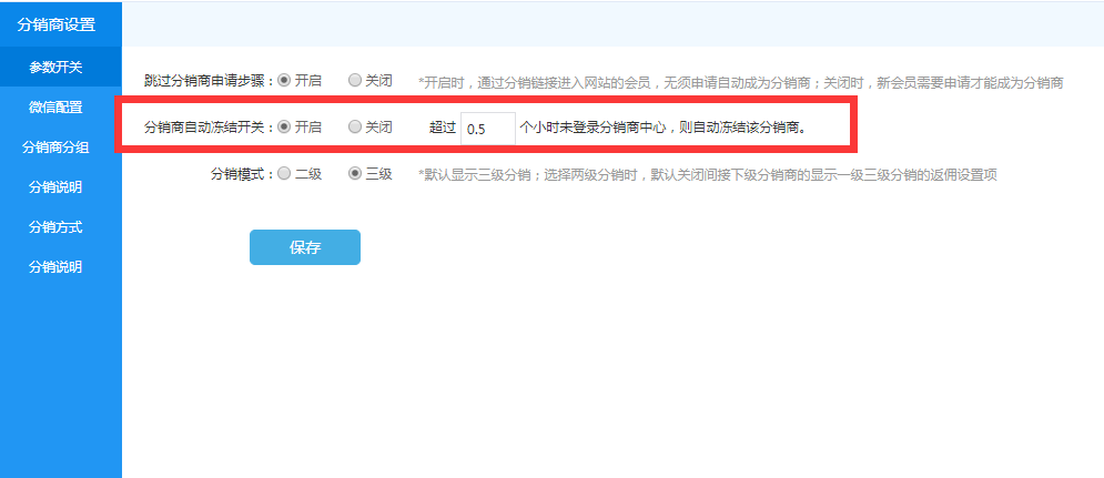 自动冻结开关开启后,系统会根据分销商的登录时长来自动进行冻结功能。