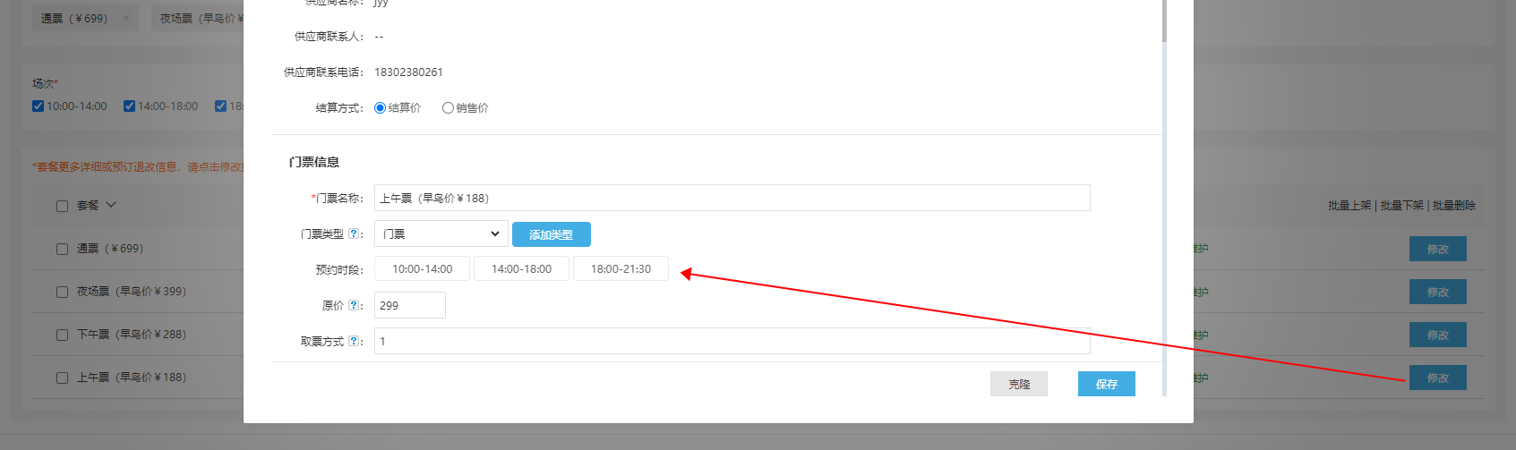 ②、修改套餐:点击上方图片中的修改按钮,编辑对应的套餐(即门票信息)