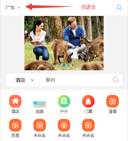 ②、选择出发地,在前台页面,定位到这个城市时,页面展示这个城市名称的产品(城市站点出发地中此区域必须处于2级或者以下并且开启)