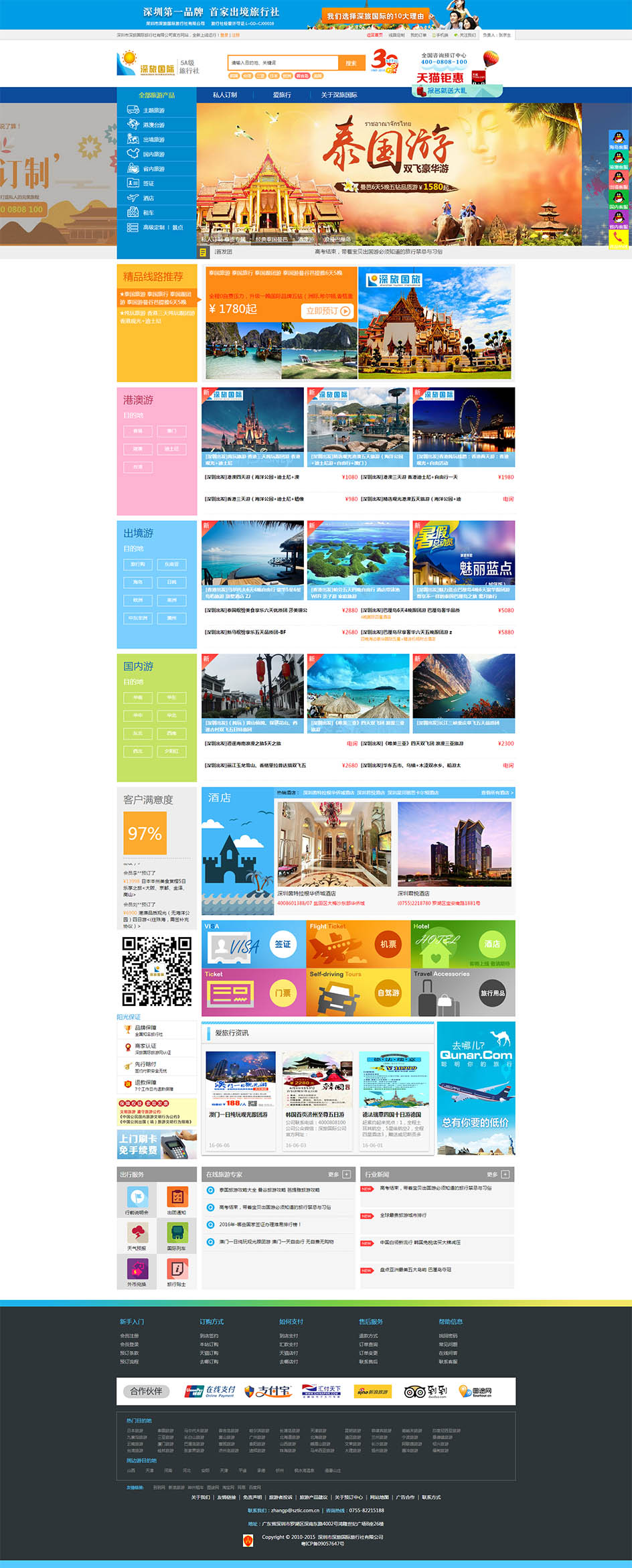 思途CMS在设计旅游网站模板的时候考虑到产品售卖问题,故设计了几大营销板块,如客户满意度、相关保证、行业新闻、出行服务等相关板块!其中出行服务一块中不止可以放自己的其他产品,还可以与其他第三方进行合作,实现资源互换,让旅游网站营销轻而易举!