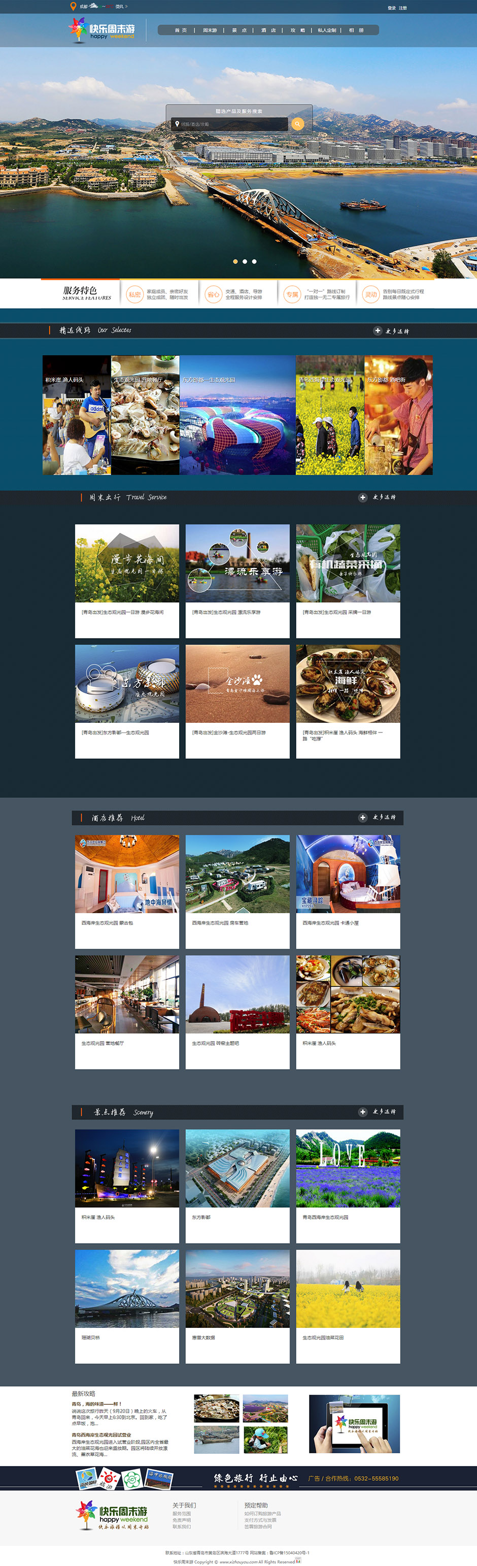 网站Banner占了满屏,用户一进网站就被精致的Banner大图吸引,第一印象良好。Banner上方有个定位显示,显示用户当地天气情况,独具匠心。首页精选线路一栏采用相册式滑动设计风格,增加网站时尚感,增强网页展示效果。首页分类清晰,每个栏目产品完整,图片优美。产品详情页图文相配,增加用户查看线路的趣味性。网站只做青岛以及周边的短途旅行,容易打造当地品牌特色。