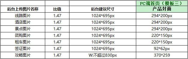 (1)电脑端的图片上传建议尺寸与前台显示的尺寸列表