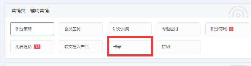 进入卡券后台页面。网站后台>营销类>辅助营销>卡券》优惠券