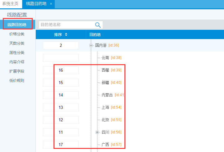 4、四个目的地版块的排序,在线路目的地中找到四个大目的地,数字排序即可