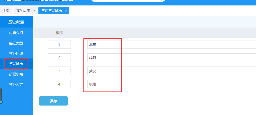 签发城市是一个要以自定义添加删除和排序功能,在具体签证添加时,可以按此属性进行分类。