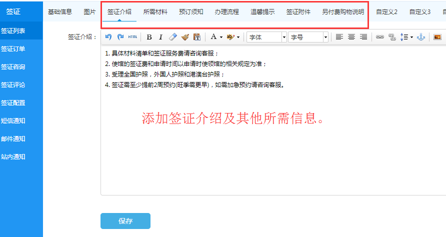 支持签证产品添加额外的内容介绍、图片。
