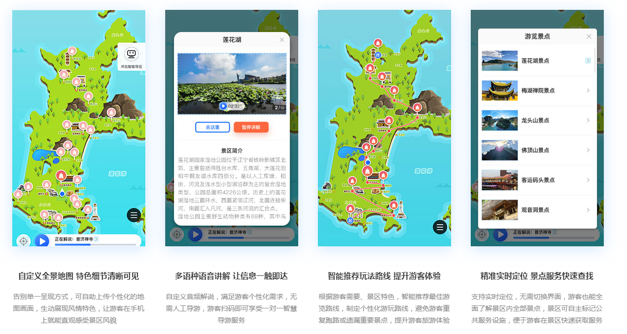 让游客通过手机即可获取一对一的智慧导游服务,满足游客景区信息查找需求,帮助景区实现全景展示、语音讲解、路线规划、信息传递等一体化导览服务。