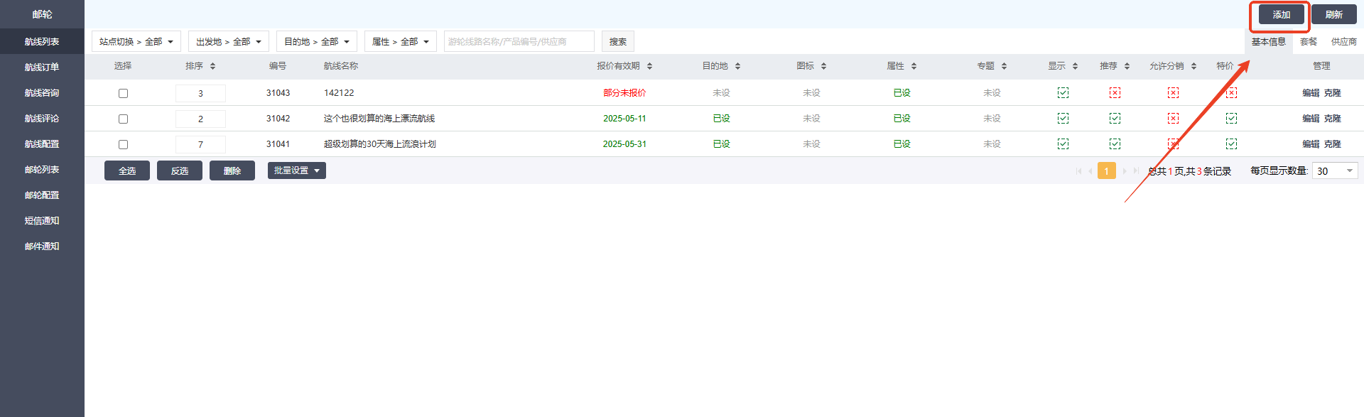 航线配置页的分类就较为简单了,每个邮轮不同时间有不同的航线,添加航线之前首先要进行配置。