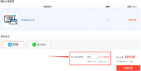 A.先在“使用思途积分”前打勾,然后输入积分。“移动端LBS”应用正常售价为:298元,活动期间最高可抵199元=1990积分!输入积分1990个,支付99元即可活动“移动端LBS”应用!