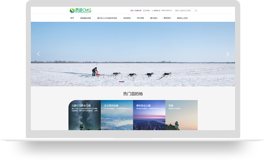 此套模板适合产品类型少的旅游网站建设,比如:单目的地以及私人定制类型产品。网站顶部banner简洁大气,突显网站高端风格。网站首页呈现形式以图片为主,具有极强的视觉吸引力。产品特色突显,增加产品吸引力,有助于提升游客在网站上的停留时间。* 该模板不支持二级导航,不支持自定义导航,不支持右侧模块。该模板不支持换肤。
